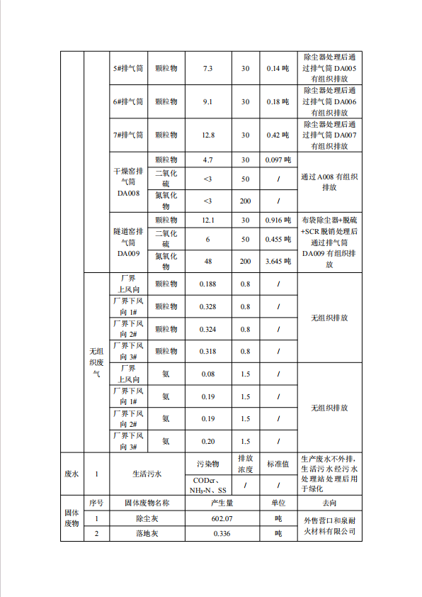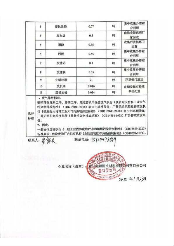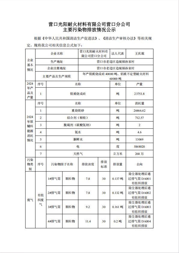 營(yíng)口光陽(yáng)耐火材料有限公司營(yíng)口分公司主要污染物排放情況公示